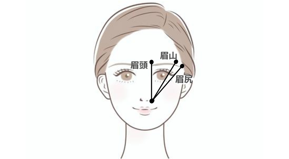 眉頭は小鼻から目頭の延長線上、眉山は小鼻から黒目の端の延長線上、眉尻は小鼻から目じりの延長線上に印を取ると黄金比になると言われています。