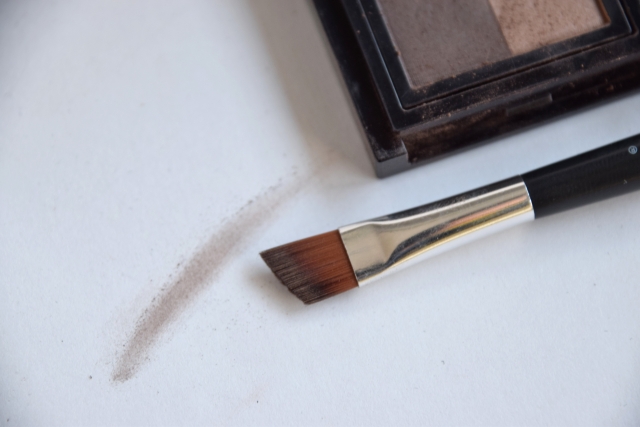 眉尻が薄いとぼやけた印象になってしまうため、なるべくコシのある固めのブラシを使い、しっかり目に色を乗せます。