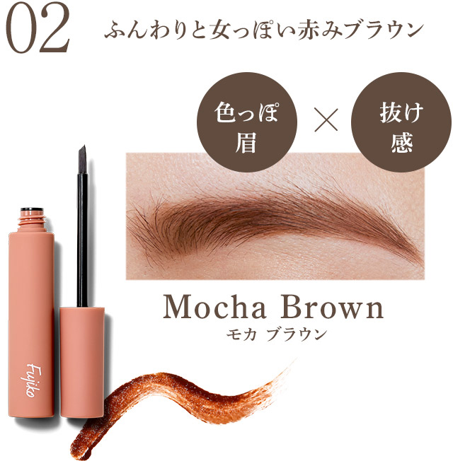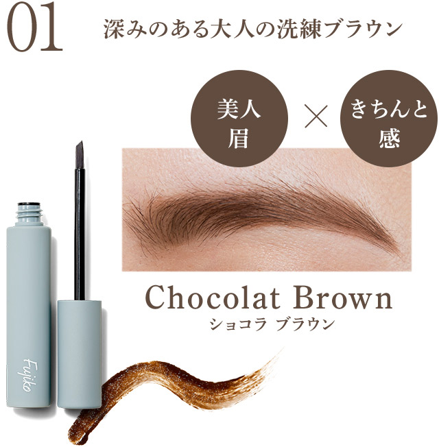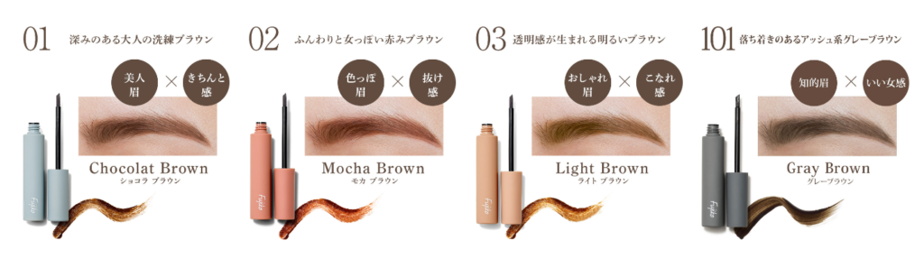 フジコの眉ティントのカラー展開は、「ショコラブラウン」「モカブラウン」「ライトブラウン」「グレーブラウン」の4色。