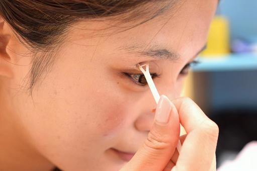 二重幅のラインをなぞるようにのりを塗り、その際はまつ毛に付かないよう慎重に進めていきましょう。